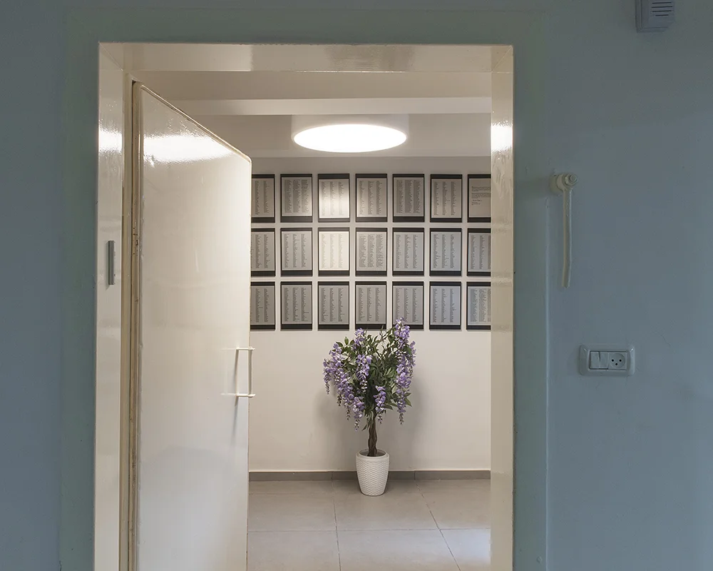 Donor plaques at the entrance of the L'Chaim Holocaust Survivors Group Center/public bomb shelter, Jerusalem.