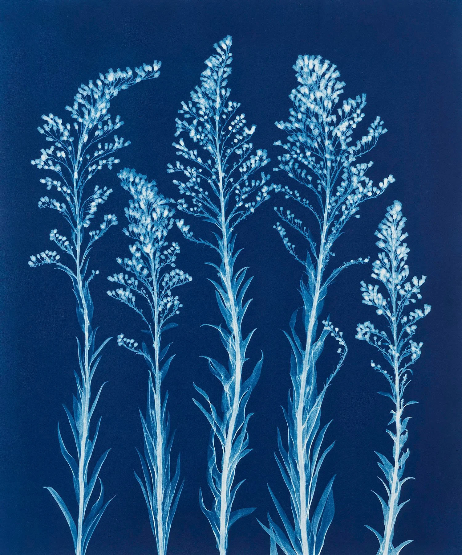 The prints are made by the cyanotype process, which is one of the very earliest photographic processes in use since the 1840’s. Fine watercolor paper is coated by brush with the cyanotype solution which contains iron salts. After the coated paper has been dried in the dark it is placed in contact under glass with the digitally printed internegative and exposed to UV light using an LED exposure unit. The UV light activates a photochemical process that turns the exposed cyanotype into shades of Prussian blue. The print is then removed from the negative and developed in a tray of water, which washes away the unexposed cyanotype, leaving the final image.
